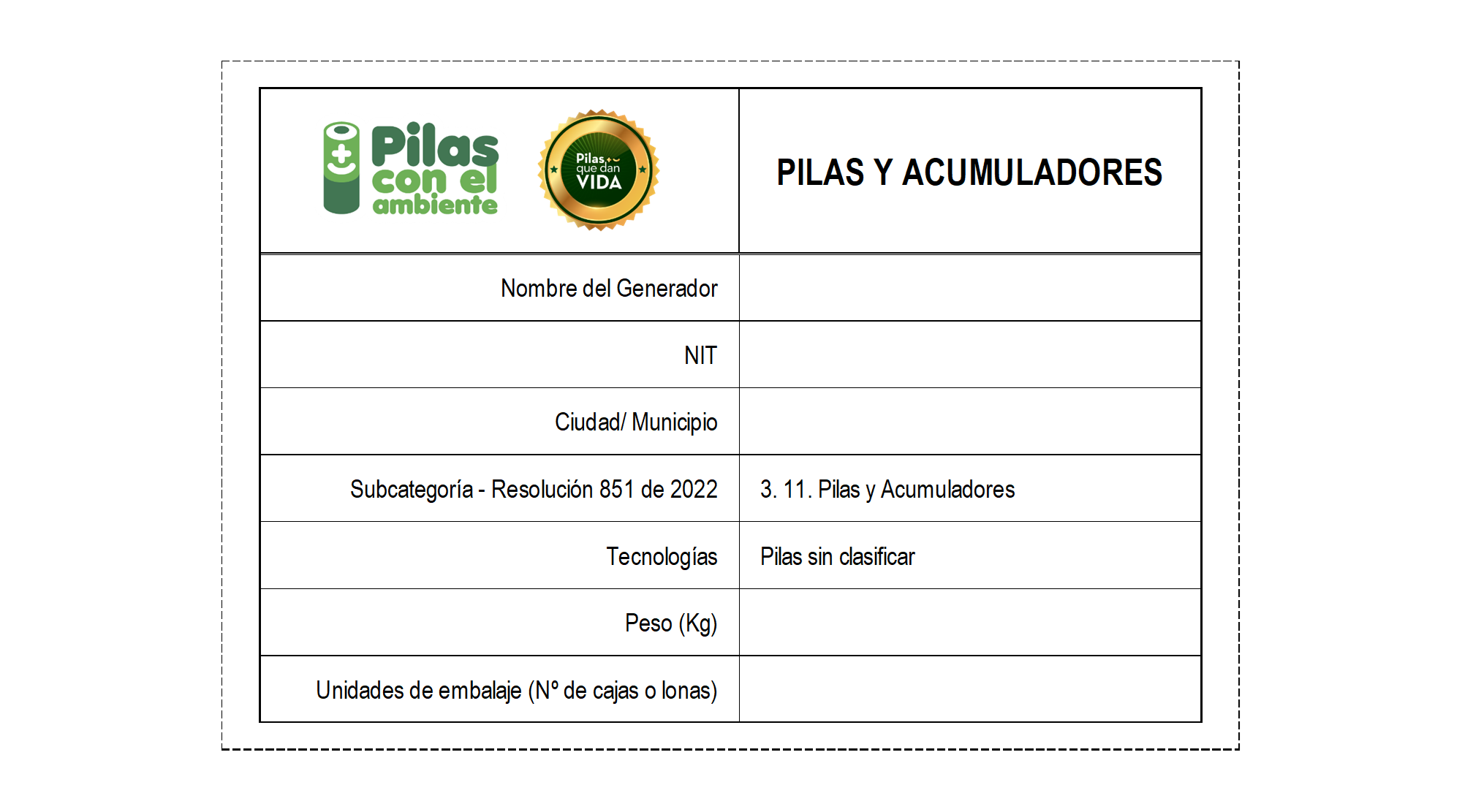 Para que podamos gestionar la recolección de tus residuos de manera segura y eficiente, te sugerimos entregarlos correctamente embalados y etiquetados. Recomendaciones Técnicas: 1. Embalaje: Utilizar canecas plásticas rígidas con tapa (5 gal a 55 gal), lonas de polipropileno en optimas condiciones (no superar el 80% de capacidad), cajas de cartón con doble bolsa plástica y encintada. Si la cantidad es baja se recomienda en envases plásticos rígidos de menor tamaño con tapa. 2. Etiqueta de Identificación: Cada unidad debe tener una etiqueta clara. Por ejemplo: "Pilas Alcalinas" o, en caso de no conocer el tipo, "Pilas sin Clasificar". Se debe enviar registro fotográfico del contenedor o punto ecológico (% de llenado) y/o el estado de las baterías (embalaje) antes de realizar la recepción o recolección en el lugar de origen.